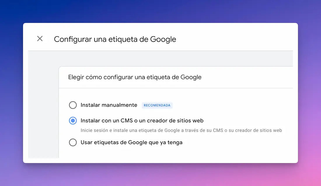 Si tienes una web construida con WordPress u otro CMS, puedes elegir esta opción para instalar el código de seguimiento, en el caso de WP con la ayuda del plugin oficial de Google “Site Kit”.
