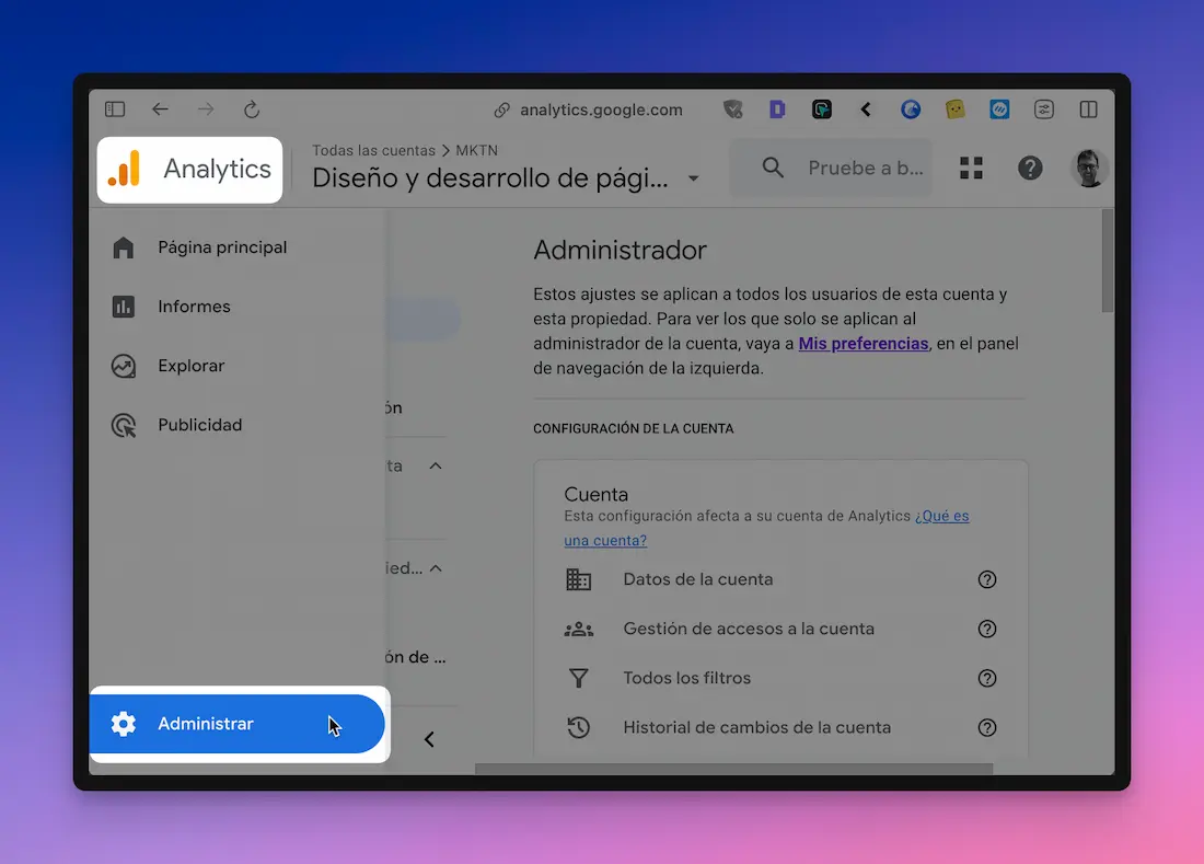 En el panel principal de Analytics, haz clic en la última opción del menú lateral: “Administrar”.