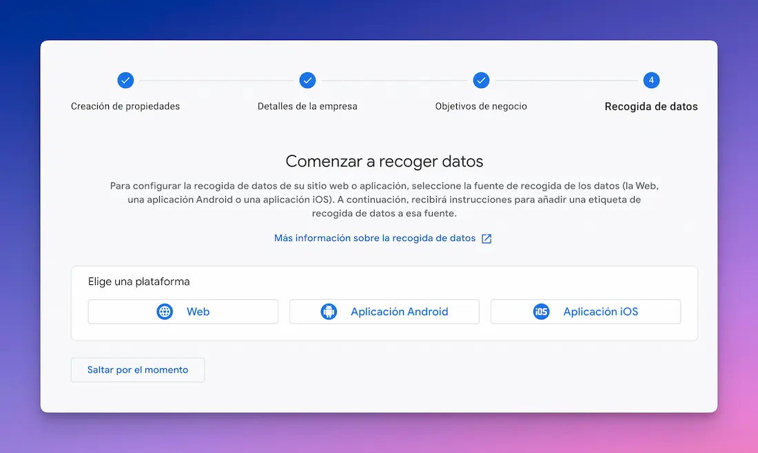 Finalmente elige la fuente de los datos que deseas analizar, entre aplicaciones Web, Android o iOS.