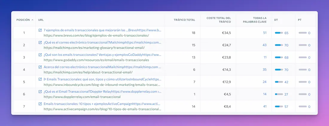 Haz clic en “Ver informe detallado” y verás el listado completo, con las métricas de autoridad: Domain Trust (DT) y Page Trust (PT). Ahora puedes filtrar por autoridad, descargar el listado, etc.