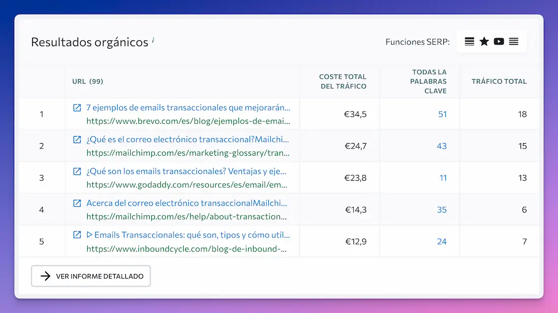 Investigacion de palabras clave con SERanking Resultados organicos Detalle