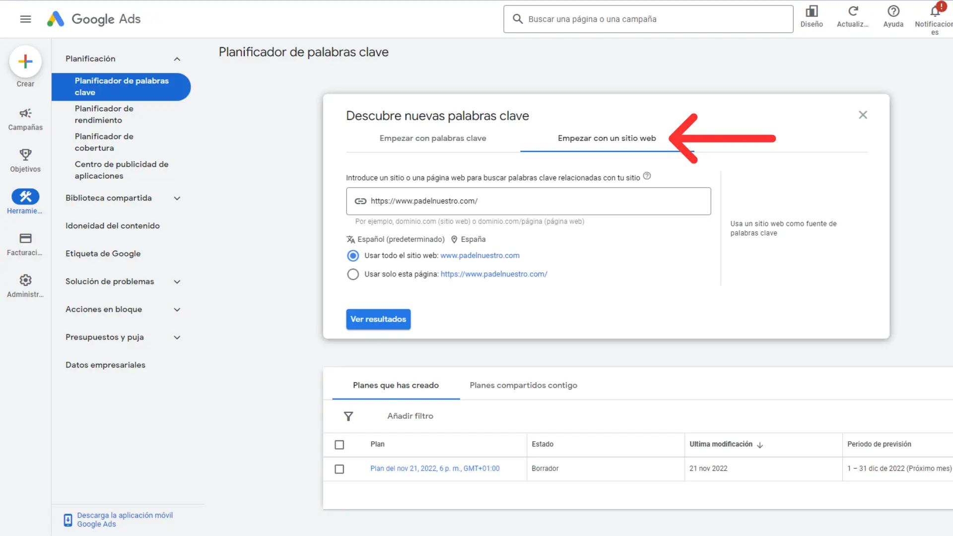 Después, vamos a entrar a nuestra cuenta de Google Ads (haz clic aquí) y seguir estos pasos para cada uno de los competidores que hayamos elegido:
